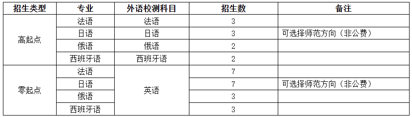注:零起点一般指高中外语语种为英语的考生,高起点指考生高考语种为我校相应招生语言专业的考生。